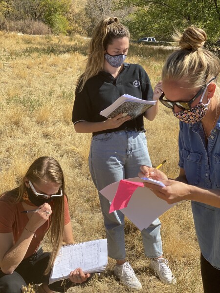 Associate Professor Seth Bybee and Assistant Professor Paul Frandsen with student Alyssa Pike in the field researching Dragonflies.